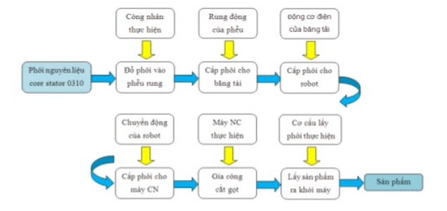 Với sơ đồ khối cấp phôi tự động như trên, thì toàn bộ quá trình cấp phôi điều được thực hiện tự động. Người công nhân chỉ có nhiệm vụ đổ phôi vào phễu rung. Thao tác này chỉ thực hiện 2 lần/ca làm việc.
